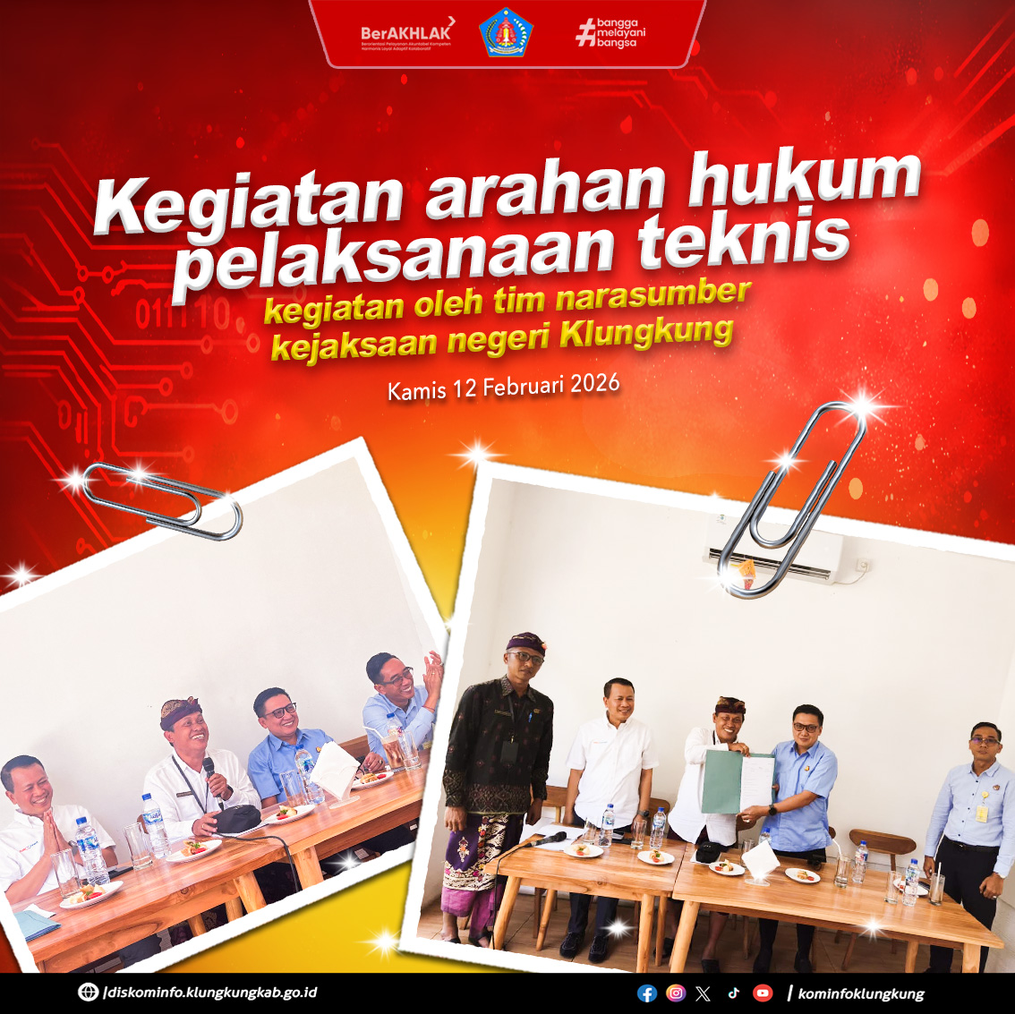 Kegiatan dilaksanakan sebagai bagian dari penguatan pemahaman hukum dalam pelaksanaan teknis kegiatan di lingkungan Dinas Komunikasi dan Informatika Kabupaten Klungkung. Kegiatan yang dibuka secara resmi oleh Kepala Dinas Komunikasi dan Informatika Kabupaten Klungkung ini dihadiri oleh Kepala Kejaksaan Negeri Klungkung (R. Indra Sanjaya,S.H.,M.H.) bersama jajaran, Kepada Bidang Telematika Diskominfo beserta jajaran, serta penyedia barang/jasa yang … Baca Selengkapnya
