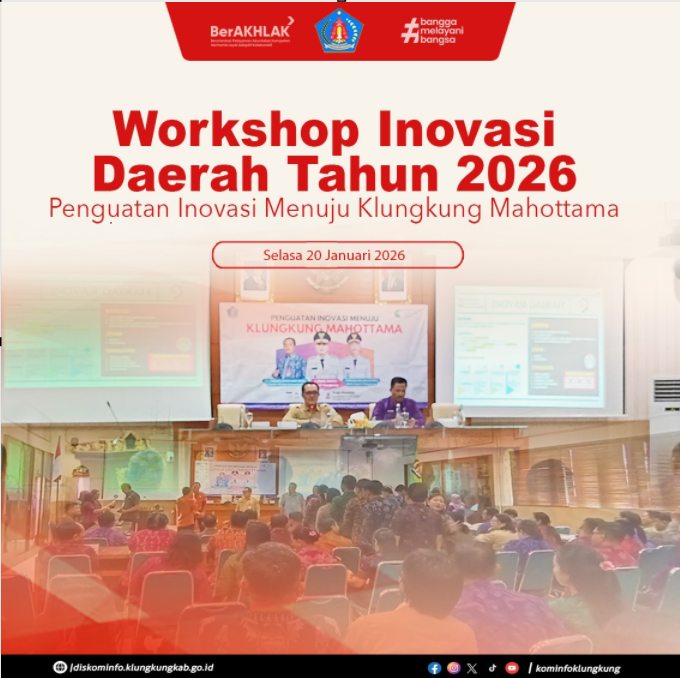Klungkung – 20 Januari 2026 Komitmen Pemerintah Kabupaten Klungkung untuk terus menghadirkan pelayanan publik yang lebih baik kembali ditegaskan melalui Workshop Inovasi Daerah Tahun 2026 bertajuk “Penguatan Inovasi Menuju Klungkung Mahottama”. Kegiatan yang diselenggarakan oleh Badan Riset dan Inovasi Daerah (BRIDA) Kabupaten Klungkung ini berlangsung di Ruang Rapat Praja Mandala, Kantor Bupati Klungkung, Selasa (20/1/2026).
