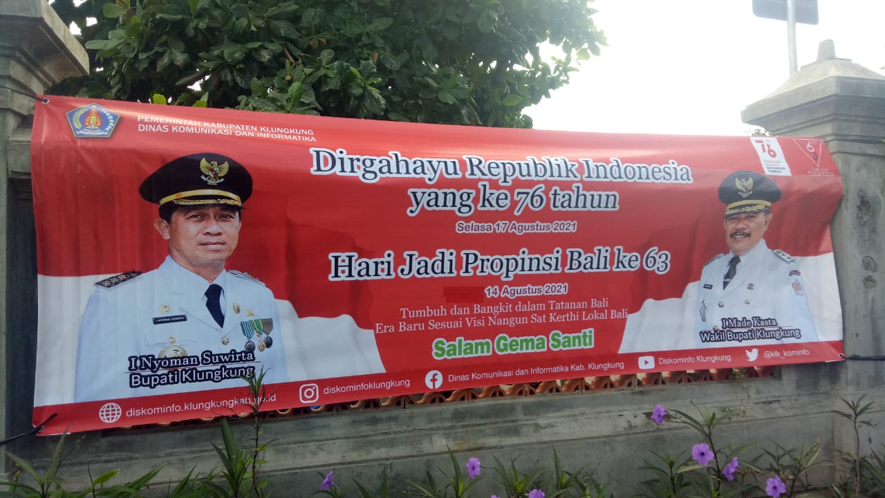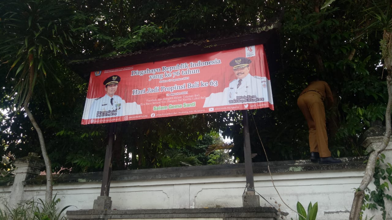 Dinas Komunikasi dan Informatika Kabupaten Klungkung melakukan pemasangan Baliho/ Spanduk terkait dengan Dirgahayu Republik Indonesia Ke 76 Tahun dan Hari Jadi Provinsi Bali Ke 63. Pemasangan Baliho/ Spanduk dilakukan di seputaran Kecamatan Klungkung, Kecamatan Banjarangkan dan Kecamatan Dawan dengan tetap melaksanakan Protokol Kesehatan, Senin, 9/8/2021.